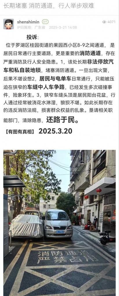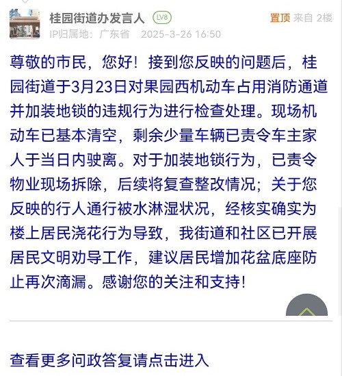 尊敬的市民,您好!接到您反映的問(wèn)題后,桂園街道于3月23日對(duì)果園西機(jī)動(dòng)車(chē)占用消防通道并加裝地鎖的違規(guī)行為進(jìn)行檢查處理?,F(xiàn)場(chǎng)機(jī)動(dòng)車(chē)已基本清空,剩余少量車(chē)輛已責(zé)令車(chē)主家人于當(dāng)日內(nèi)駛離。對(duì)于加裝地鎖行為,已責(zé)令物業(yè)現(xiàn)場(chǎng)拆除,后續(xù)將復(fù)查整改情況;關(guān)于您反映的行人通行被水淋濕狀況,經(jīng)核實(shí)確實(shí)為樓上居民澆花行為導(dǎo)致,我街道和社區(qū)已開(kāi)展居民文明勸導(dǎo)工作,建議居民增加花盆底座防止再次滴漏。感謝您的關(guān)注和支持!
