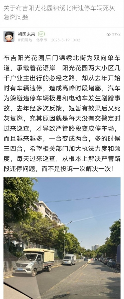 9. 帖文《關(guān)于布吉陽(yáng)光花園錦繡北街違停車(chē)輛死灰復(fù)燃問(wèn)題》