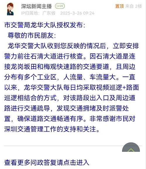 尊敬的市民朋友:龍華交警大隊(duì)收到您反映的情況后,立即安排警力前往石清大道進(jìn)行核查。因石清大道是連接龍崗坂田和梅觀快速路的交通要道,且周邊分布有多個(gè)工業(yè)區(qū),人流量、車(chē)流量大。一直以來(lái),龍華交警大隊(duì)每日均采取視頻巡邏+路面巡邏相結(jié)合的方式,對(duì)該路段出入口及周邊道路進(jìn)行交通疏導(dǎo),發(fā)現(xiàn)交通擁堵及時(shí)派警處置,確保道路交通暢通有序。非常感謝市民對(duì)深圳交通管理工作的支持和關(guān)注。
