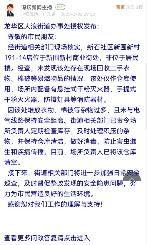 尊敬的市民朋友:經(jīng)街道相關(guān)部門(mén)現(xiàn)場(chǎng)核實(shí),新石社區(qū)新圍新村191-14店位于新圍新村商業(yè)街處,非位于居民樓。經(jīng)查,未發(fā)現(xiàn)該處存在現(xiàn)場(chǎng)回收二手衣物、棉被等易燃物品的情況,該處僅作倉(cāng)庫(kù)使用,場(chǎng)所內(nèi)配備有懸掛式干粉滅火器、手提式干粉滅火器、防爆燈具等消防器材。因該處堆放衣物、棉被等雜物過(guò)多,且未與電氣線路保持安全距離。街道相關(guān)部門(mén)已責(zé)令場(chǎng)所負(fù)責(zé)人定期檢查庫(kù)存,及時(shí)處理積壓的雜物,并保持倉(cāng)庫(kù)清潔,做好消毒,防止害蟲(chóng)滋生和疾病傳播。目前,場(chǎng)所負(fù)責(zé)人已將該倉(cāng)庫(kù)清空。接下來(lái),街道相關(guān)部門(mén)將進(jìn)一步加強(qiáng)日常安全巡查,及時(shí)督促整改發(fā)現(xiàn)的安全隱患問(wèn)題,努力為市民營(yíng)造良好的生活環(huán)境。感謝您對(duì)我們工作的理解與支持!