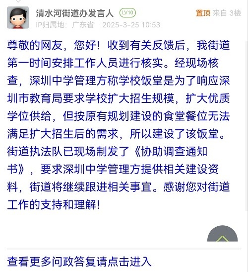 尊敬的網(wǎng)友,您好!收到有關(guān)反饋后,我街道第一時(shí)間安排工作人員進(jìn)行核實(shí)。經(jīng)現(xiàn)場(chǎng)核查,深圳中學(xué)管理方稱(chēng)學(xué)校飯?zhí)檬菫榱隧憫?yīng)深圳市教育局要求學(xué)校擴(kuò)大招生規(guī)模,擴(kuò)大優(yōu)質(zhì)學(xué)位供給,但按原有規(guī)劃建設(shè)的食堂餐位無(wú)法滿足擴(kuò)大招生后的需求,所以建設(shè)了該飯?zhí)谩=值缊?zhí)法隊(duì)已現(xiàn)場(chǎng)制發(fā)了《協(xié)助調(diào)查通知書(shū)》,要求深圳中學(xué)管理方提供相關(guān)建設(shè)資料,街道將繼續(xù)跟進(jìn)相關(guān)事宜。感謝您對(duì)街道工作的支持和理解!