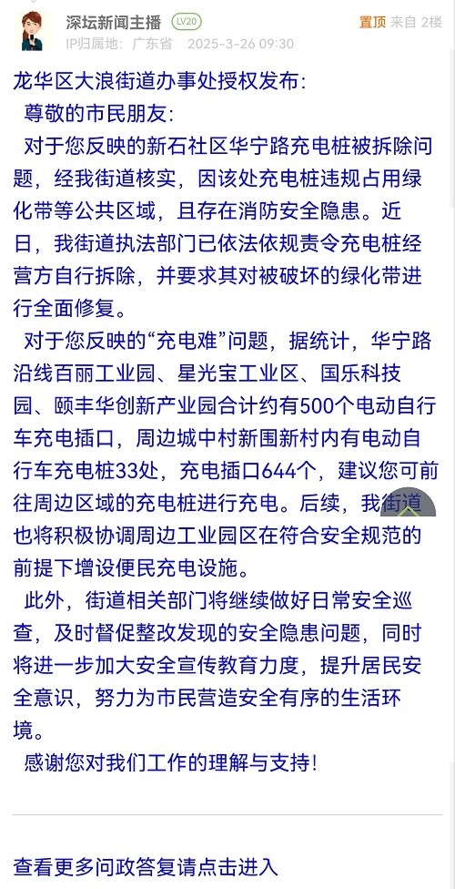 尊敬的市民朋友:對(duì)于您反映的新石社區(qū)華寧路充電樁被拆除問(wèn)題,經(jīng)我街道核實(shí),因該處充電樁違規(guī)占用綠化帶等公共區(qū)域,且存在消防安全隱患。近日,我街道執(zhí)法部門(mén)已依法依規(guī)責(zé)令充電樁經(jīng)營(yíng)方自行拆除,并要求其對(duì)被破壞的綠化帶進(jìn)行全面修復(fù)。對(duì)于您反映的“充電難”問(wèn)題,據(jù)統(tǒng)計(jì),華寧路沿線百麗工業(yè)園、星光寶工業(yè)區(qū)、國(guó)樂(lè)科技園、頤豐華創(chuàng)新產(chǎn)業(yè)園合計(jì)約有500個(gè)電動(dòng)自行車(chē)充電插口,周邊城中村新圍新村內(nèi)有電動(dòng)自行車(chē)充電樁33處,充電插口644個(gè),建議您可前往周邊區(qū)域的充電樁進(jìn)行充電。后續(xù),我街道也將積極協(xié)調(diào)周邊工業(yè)園區(qū)在符合安全規(guī)范的前提下增設(shè)便民充電設(shè)施。此外,街道相關(guān)部門(mén)將繼續(xù)做好日常安全巡查,及時(shí)督促整改發(fā)現(xiàn)的安全隱患問(wèn)題,同時(shí)將進(jìn)一步加大安全宣傳教育力度,提升居民安全意識(shí),努力為市民營(yíng)造安全有序的生活環(huán)境。感謝您對(duì)我們工作的理解與支持!