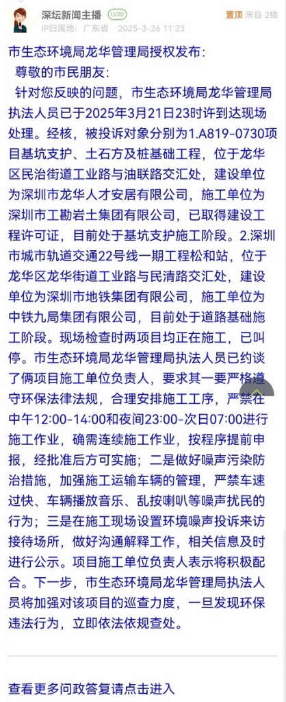 尊敬的市民朋友:針對(duì)您反映的問(wèn)題,市生態(tài)環(huán)境局龍華管理局執(zhí)法人員已于2025年3月21日23時(shí)許到達(dá)現(xiàn)場(chǎng)處理。經(jīng)核,被投訴對(duì)象分別為1.A819-0730項(xiàng)目基坑支護(hù)、土石方及樁基礎(chǔ)工程,位于龍華區(qū)民治街道工業(yè)路與油聯(lián)路交匯處,建設(shè)單位為深圳市龍華人才安居有限公司,施工單位為深圳市工勘巖土集團(tuán)有限公司,已取得建設(shè)工程許可證,目前處于基坑支護(hù)施工階段。2.深圳市城市軌道交通22號(hào)線一期工程松和站,位于龍華區(qū)龍華街道工業(yè)路與民清路交匯處,建設(shè)單位為深圳市地鐵集團(tuán)有限公司,施工單位為中鐵九局集團(tuán)有限公司,目前處于道路基礎(chǔ)施工階段?,F(xiàn)場(chǎng)檢查時(shí)兩項(xiàng)目均正在施工,已叫停。市生態(tài)環(huán)境局龍華管理局執(zhí)法人員已約談了倆項(xiàng)目施工單位負(fù)責(zé)人,要求其一要嚴(yán)格遵守環(huán)保法律法規(guī),合理安排施工工序,嚴(yán)禁在中午12:00-14:00和夜間23:00-次日07:00進(jìn)行施工作業(yè),確需連續(xù)施工作業(yè),按程序提前申報(bào),經(jīng)批準(zhǔn)后方可實(shí)施;二是做好噪聲污染防治措施,加強(qiáng)施工運(yùn)輸車(chē)輛的管理,嚴(yán)禁車(chē)速過(guò)快、車(chē)輛播放音樂(lè)、亂按喇叭等噪聲擾民的行為;三是在施工現(xiàn)場(chǎng)設(shè)置環(huán)境噪聲投訴來(lái)訪接待場(chǎng)所,做好溝通解釋工作,相關(guān)信息及時(shí)進(jìn)行公示。項(xiàng)目施工單位負(fù)責(zé)人表示將積極配合。下一步,市生態(tài)環(huán)境局龍華管理局執(zhí)法人員將加強(qiáng)對(duì)該項(xiàng)目的巡查力度,一旦發(fā)現(xiàn)環(huán)保違法行為,立即依法依規(guī)查處。