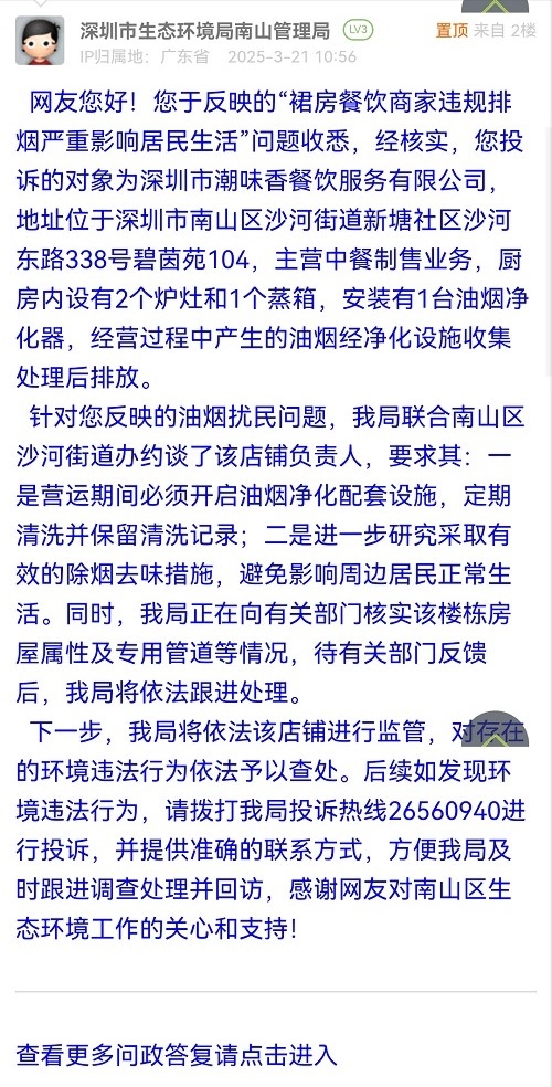針對(duì)您反映的油煙擾民問(wèn)題,我局聯(lián)合南山區(qū)沙河街道辦約談了該店鋪負(fù)責(zé)人,要求其:一是營(yíng)運(yùn)期間必須開(kāi)啟油煙凈化配套設(shè)施,定期清洗并保留清洗記錄;二是進(jìn)一步研究采取有效的除煙去味措施,避免影響周邊居民正常生活。同時(shí),我局正在向有關(guān)部門(mén)核實(shí)該樓棟房屋屬性及專(zhuān)用管道等情況,待有關(guān)部門(mén)反饋后,我局將依法跟進(jìn)處理。