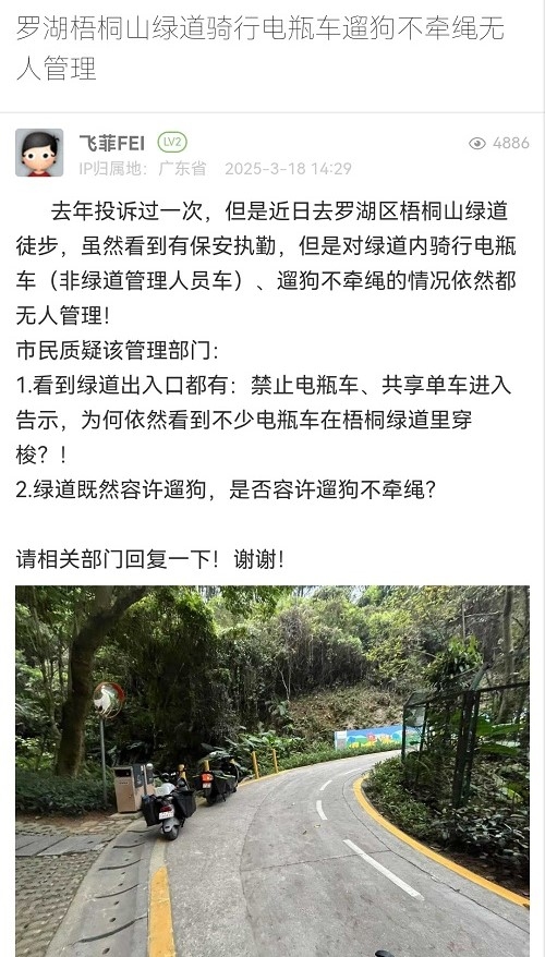 34. 帖文《羅湖梧桐山綠道騎行電瓶車(chē)遛狗不牽繩無(wú)人管理》