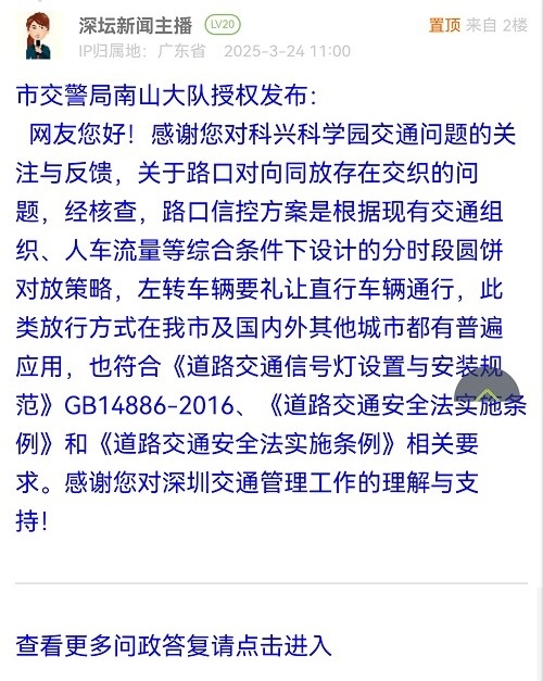 網(wǎng)友您好!感謝您對(duì)科興科學(xué)園交通問(wèn)題的關(guān)注與反饋,關(guān)于路口對(duì)向同放存在交織的問(wèn)題,經(jīng)核查,路口信控方案是根據(jù)現(xiàn)有交通組織、人車(chē)流量等綜合條件下設(shè)計(jì)的分時(shí)段圓餅對(duì)放策略,左轉(zhuǎn)車(chē)輛要禮讓直行車(chē)輛通行,此類(lèi)放行方式在我市及國(guó)內(nèi)外其他城市都有普遍應(yīng)用,也符合《道路交通信號(hào)燈設(shè)置與安裝規(guī)范》GB14886-2016、《道路交通安全法實(shí)施條例》和《道路交通安全法實(shí)施條例》相關(guān)要求。感謝您對(duì)深圳交通管理工作的理解與支持!