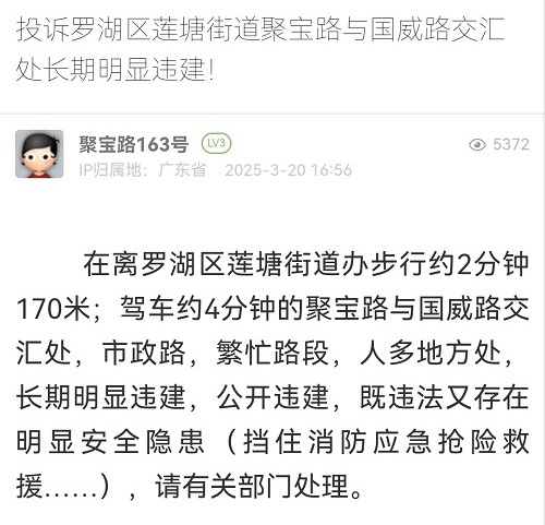 15. 帖文《投訴羅湖區(qū)蓮塘街道聚寶路與國(guó)威路交匯處長(zhǎng)期明顯違建!》