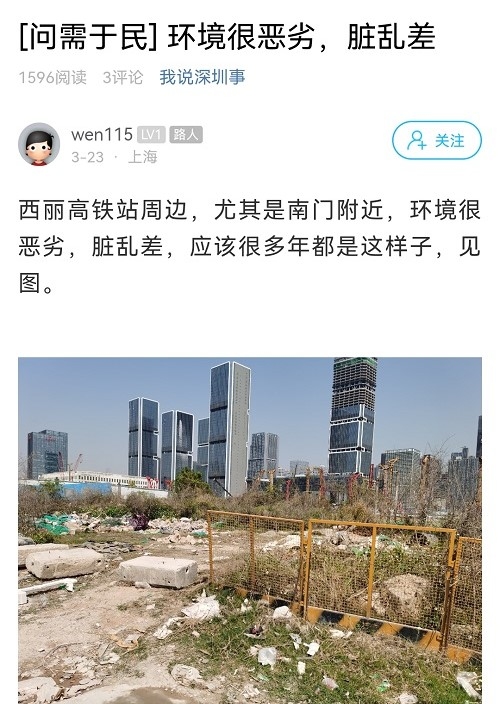 尊敬的市民朋友,您好!首先感謝市民對(duì)南山區(qū)環(huán)境衛(wèi)生管理工作的關(guān)注和監(jiān)督,針對(duì)您反映的問(wèn)題,我局高度重視,認(rèn)真核實(shí)處理,具體情況回復(fù)如下:經(jīng)核查,市民反映的地塊為西麗高鐵項(xiàng)目征收地塊,前期西麗街道統(tǒng)一開(kāi)展西麗高鐵項(xiàng)目土地整備工作,目前正推進(jìn)征收,周邊商家和業(yè)主正逐步搬離,相應(yīng)地塊已逐一移交至西麗高鐵項(xiàng)目進(jìn)行管理,待項(xiàng)目開(kāi)工將統(tǒng)一進(jìn)行清理。此外,我局已督促西麗街道聯(lián)合社區(qū)針對(duì)西麗高鐵項(xiàng)目及周邊地塊進(jìn)行全范圍嚴(yán)格巡查和監(jiān)管,避免違法傾倒垃圾、傾倒渣土等行為發(fā)生。后續(xù),保潔公司將對(duì)該區(qū)域進(jìn)行不定期的常態(tài)化巡查,避免此類(lèi)事件再次發(fā)生。感謝市民的理解和支持,給市民帶來(lái)的不便,我們深表歉意。我們將牢固樹(shù)立以人民為中心的思想,竭誠(chéng)做好城市管理和為民服務(wù)工作,努力為市民創(chuàng)造良好的城市環(huán)境。