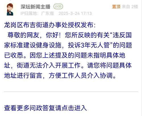 5. 帖文《龍崗區(qū)布吉街道辦違反國(guó)家標(biāo)準(zhǔn)建設(shè)健身設(shè)施,投訴3年無(wú)人管》
