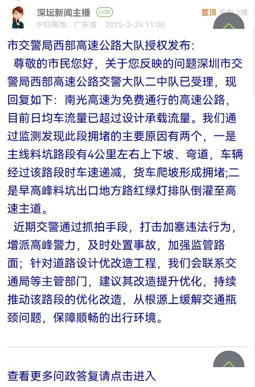 尊敬的市民您好,關(guān)于您反映的問(wèn)題深圳市交警局西部高速公路交警大隊(duì)二中隊(duì)已受理,現(xiàn)回復(fù)如下:南光高速為免費(fèi)通行的高速公路,目前日均車(chē)流量已超過(guò)設(shè)計(jì)承載流量。我們通過(guò)監(jiān)測(cè)發(fā)現(xiàn)此段擁堵的主要原因有兩個(gè),一是主線料坑路段有4公里左右上下坡、彎道,車(chē)輛經(jīng)過(guò)該路段時(shí)車(chē)速遞減,貨車(chē)爬坡形成擁堵;二是早高峰料坑出口地方路紅綠燈排隊(duì)倒灌至高速主道。