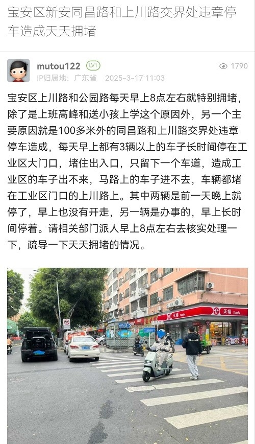 2. 帖文《寶安區(qū)新安同昌路和上川路交界處違章停車(chē)造成天天擁堵》