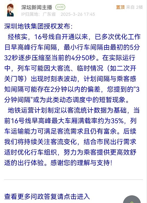 經(jīng)核實(shí),16號(hào)線自開(kāi)通以來(lái),已多次優(yōu)化工作日早高峰行車(chē)間隔,最小行車(chē)間隔由最初的5分32秒逐步壓縮至當(dāng)前的4分50秒。在實(shí)際運(yùn)行中,列車(chē)可能因大客流、臨時(shí)情況(如二次開(kāi)關(guān)門(mén)等)出現(xiàn)時(shí)刻表波動(dòng),計(jì)劃間隔與乘客感知間隔可能存在2分鐘以?xún)?nèi)的偏差,您提到的"3分鐘間隔"或?yàn)榇祟?lèi)動(dòng)態(tài)調(diào)度中的短暫現(xiàn)象。地鐵運(yùn)營(yíng)計(jì)劃制定以客流統(tǒng)計(jì)數(shù)據(jù)為基礎(chǔ),當(dāng)前16號(hào)線早高峰最大車(chē)廂滿載率約為35%,列車(chē)運(yùn)輸能力可滿足客流需求且仍有富余。后續(xù)我們將持續(xù)關(guān)注客流變化,結(jié)合市民出行需求適時(shí)優(yōu)化行車(chē)組織,努力為乘客提供更高效舒適的出行體驗(yàn)。感謝您的理解與支持!