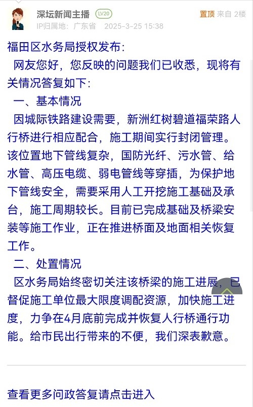 區(qū)水務(wù)局始終密切關(guān)注該橋梁的施工進(jìn)展,已督促施工單位最大限度調(diào)配資源,加快施工進(jìn)度,力爭(zhēng)在4月底前完成并恢復(fù)人行橋通行功能。給市民出行帶來(lái)的不便,我們深表歉意。