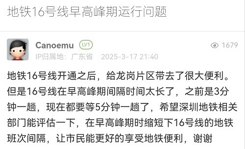 36. 帖文《地鐵16號(hào)線早高峰期運(yùn)行問(wèn)題》
