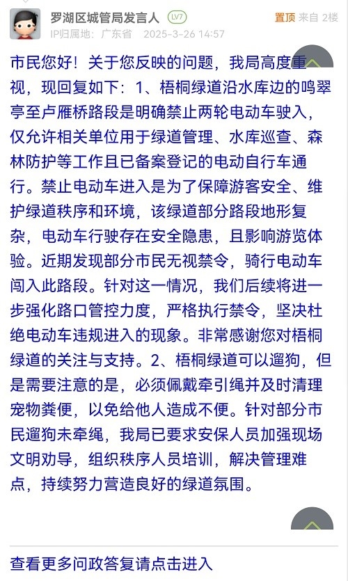 市民您好!關(guān)于您反映的問(wèn)題,我局高度重視,現(xiàn)回復(fù)如下:1、梧桐綠道沿水庫(kù)邊的鳴翠亭至盧雁橋路段是明確禁止兩輪電動(dòng)車(chē)駛?cè)耄瑑H允許相關(guān)單位用于綠道管理、水庫(kù)巡查、森林防護(hù)等工作且已備案登記的電動(dòng)自行車(chē)通行。禁止電動(dòng)車(chē)進(jìn)入是為了保障游客安全、維護(hù)綠道秩序和環(huán)境,該綠道部分路段地形復(fù)雜,電動(dòng)車(chē)行駛存在安全隱患,且影響游覽體驗(yàn)。近期發(fā)現(xiàn)部分市民無(wú)視禁令,騎行電動(dòng)車(chē)闖入此路段。針對(duì)這一情況,我們后續(xù)將進(jìn)一步強(qiáng)化路口管控力度,嚴(yán)格執(zhí)行禁令,堅(jiān)決杜絕電動(dòng)車(chē)違規(guī)進(jìn)入的現(xiàn)象。非常感謝您對(duì)梧桐綠道的關(guān)注與支持。2、梧桐綠道可以遛狗,但是需要注意的是,必須佩戴牽引繩并及時(shí)清理寵物糞便,以免給他人造成不便。針對(duì)部分市民遛狗未牽繩,我局已要求安保人員加強(qiáng)現(xiàn)場(chǎng)文明勸導(dǎo),組織秩序人員培訓(xùn),解決管理難點(diǎn),持續(xù)努力營(yíng)造良好的綠道氛圍。