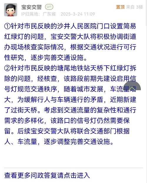 ①針對(duì)市民反映的沙井人民醫(yī)院門(mén)口設(shè)置簡(jiǎn)易紅綠燈的問(wèn)題,寶安交警大隊(duì)將積極協(xié)調(diào)街道辦現(xiàn)場(chǎng)核查實(shí)際情況,根據(jù)交通狀況進(jìn)行可行性研究,逐步完善交通設(shè)施。②針對(duì)市民反映的塘尾地鐵站天橋下紅綠燈拆除的問(wèn)題,經(jīng)核查,該路段前期先建設(shè)啟用信號(hào)燈規(guī)范交通秩序,隨著城市發(fā)展,車(chē)流量增大,為緩解行人與車(chē)輛通行的矛盾,近期新建了過(guò)街天橋??紤]到交通流量的復(fù)雜性和通行需求的多樣化,該路口的信號(hào)燈仍然需要保留。后續(xù)寶安交警大隊(duì)將聯(lián)合交通部門(mén)根據(jù)人、車(chē)流量,逐步調(diào)整完善交通設(shè)施。