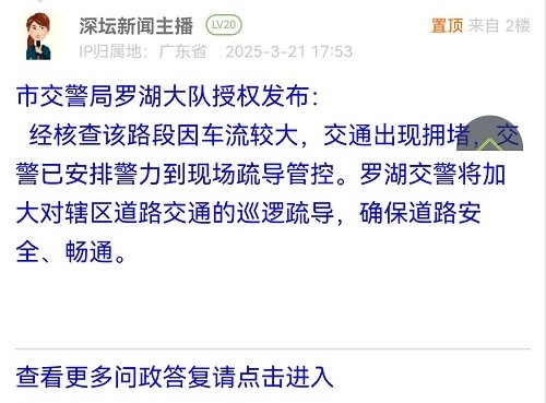 經(jīng)核查該路段因車(chē)流較大,交通出現(xiàn)擁堵,交警已安排警力到現(xiàn)場(chǎng)疏導(dǎo)管控。羅湖交警將加大對(duì)轄區(qū)道路交通的巡邏疏導(dǎo),確保道路安全、暢通。