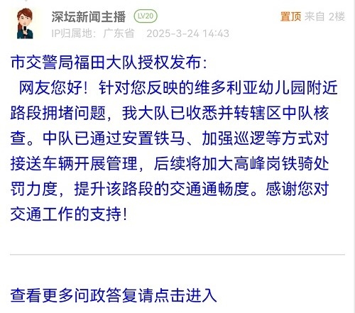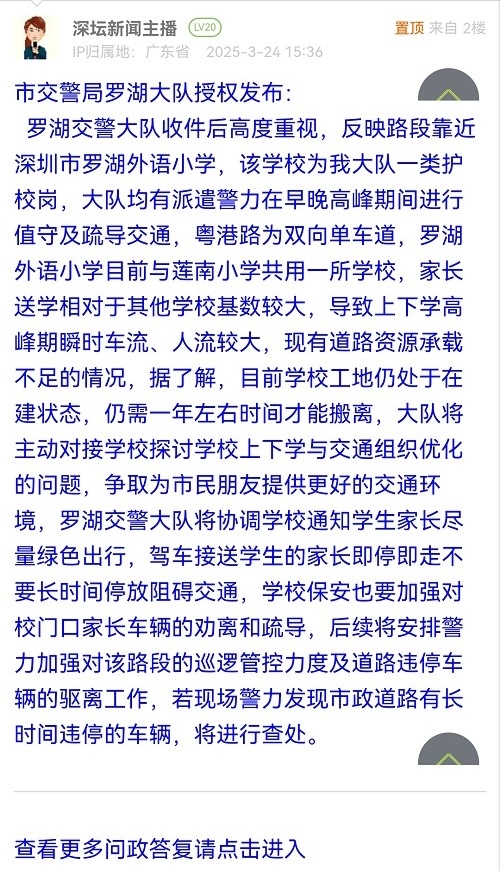 羅湖交警大隊(duì)收件后高度重視,反映路段靠近深圳市羅湖外語(yǔ)小學(xué),該學(xué)校為我大隊(duì)一類(lèi)護(hù)校崗,大隊(duì)均有派遣警力在早晚高峰期間進(jìn)行值守及疏導(dǎo)交通,粵港路為雙向單車(chē)道,羅湖外語(yǔ)小學(xué)目前與蓮南小學(xué)共用一所學(xué)校,家長(zhǎng)送學(xué)相對(duì)于其他學(xué)?;鶖?shù)較大,導(dǎo)致上下學(xué)高峰期瞬時(shí)車(chē)流、人流較大,現(xiàn)有道路資源承載不足的情況,據(jù)了解,目前學(xué)校工地仍處于在建狀態(tài),仍需一年左右時(shí)間才能搬離,大隊(duì)將主動(dòng)對(duì)接學(xué)校探討學(xué)校上下學(xué)與交通組織優(yōu)化的問(wèn)題,爭(zhēng)取為市民朋友提供更好的交通環(huán)境,羅湖交警大隊(duì)將協(xié)調(diào)學(xué)校通知學(xué)生家長(zhǎng)盡量綠色出行,駕車(chē)接送學(xué)生的家長(zhǎng)即停即走不要長(zhǎng)時(shí)間停放阻礙交通,學(xué)校保安也要加強(qiáng)對(duì)校門(mén)口家長(zhǎng)車(chē)輛的勸離和疏導(dǎo),后續(xù)將安排警力加強(qiáng)對(duì)該路段的巡邏管控力度及道路違停車(chē)輛的驅(qū)離工作,若現(xiàn)場(chǎng)警力發(fā)現(xiàn)市政道路有長(zhǎng)時(shí)間違停的車(chē)輛,將進(jìn)行查處。