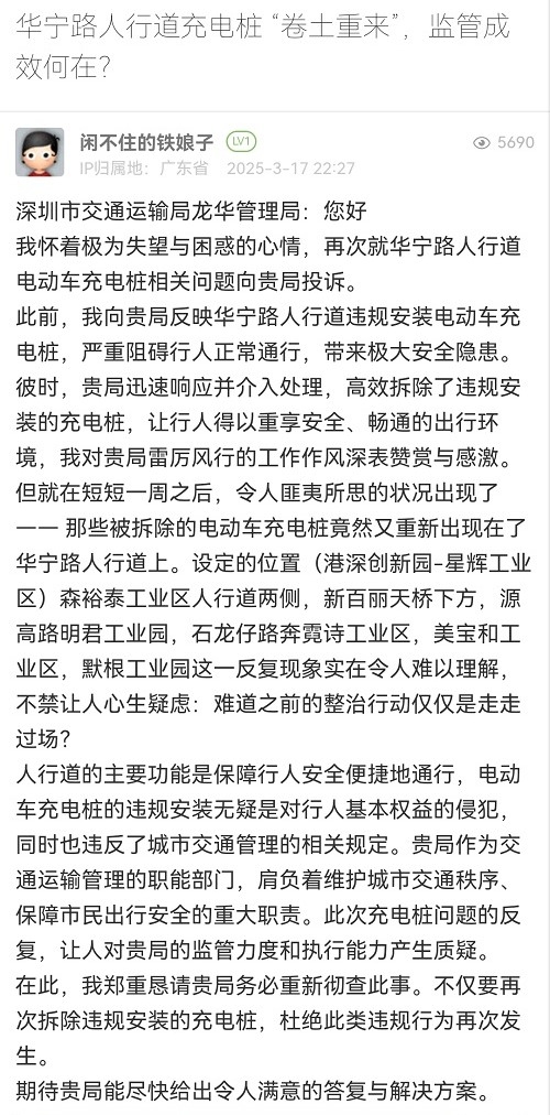 33. 帖文《華寧路人行道充電樁 “卷土重來(lái)”,監(jiān)管成效何在?》