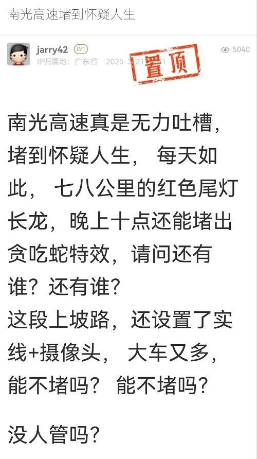 18. 帖文《南光高速堵到懷疑人生》