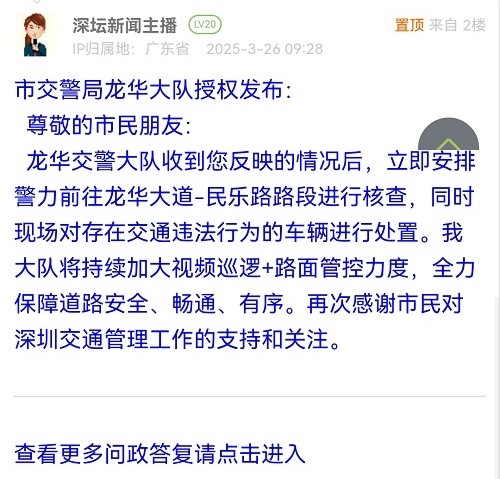 尊敬的市民朋友:龍華交警大隊(duì)收到您反映的情況后,立即安排警力前往龍華大道-民樂(lè)路路段進(jìn)行核查,同時(shí)現(xiàn)場(chǎng)對(duì)存在交通違法行為的車(chē)輛進(jìn)行處置。我大隊(duì)將持續(xù)加大視頻巡邏+路面管控力度,全力保障道路安全、暢通、有序。再次感謝市民對(duì)深圳交通管理工作的支持和關(guān)注。