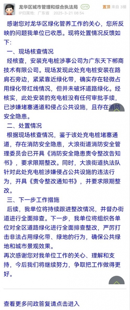 16. 帖文《緊急呼叫龍華城管局:綠化帶被充電樁 “瓜分”,快救救城市綠洲》