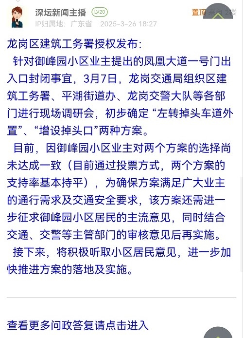 針對(duì)御峰園小區(qū)業(yè)主提出的鳳凰大道一號(hào)門(mén)出入口封閉事宜,3月7日,龍崗交通局組織區(qū)建筑工務(wù)署、平湖街道辦、龍崗交警大隊(duì)等各部門(mén)進(jìn)行現(xiàn)場(chǎng)調(diào)研會(huì),初步確定 “左轉(zhuǎn)掉頭車(chē)道外置”、“增設(shè)掉頭口”兩種方案。目前,因御峰園小區(qū)業(yè)主對(duì)兩個(gè)方案的選擇尚未達(dá)成一致(目前通過(guò)投票方式,兩個(gè)方案的支持率基本持平),為確保方案滿足廣大業(yè)主的通行需求及交通安全要求,該方案還需進(jìn)一步征求御峰園小區(qū)居民的主流意見(jiàn),同時(shí)結(jié)合交通、交警等主管部門(mén)的審核意見(jiàn)后再實(shí)施。接下來(lái),將積極聽(tīng)取小區(qū)居民意見(jiàn),進(jìn)一步加快推進(jìn)方案的落地及實(shí)施。