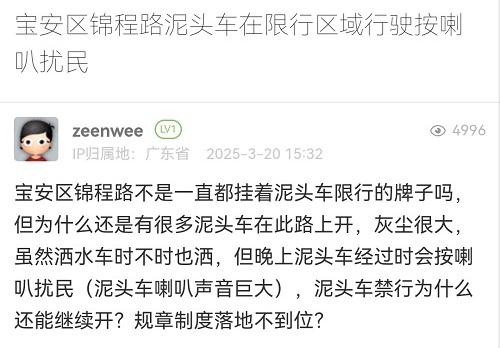 22. 帖文《寶安區(qū)錦程路泥頭車(chē)在限行區(qū)域行駛按喇叭擾民》