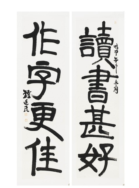 鐘廷良學(xué)書的過程離不開他的收藏,也得益于他的收藏!2011年收得清代書壇巨匠伊秉綬一副對聯(lián)后,細細研摩臨寫。此后,也有所悟所得。2012年收得民國舊拓“泰山金剛經(jīng)”集聯(lián)后,對泰山金剛經(jīng)刻石奉為至尊,敬若神明。爾后,凡作大字,皆以其為架構(gòu),而其書也漸有可觀者。由于長期從事文字工作之關(guān)系。讀書,亦成了鐘廷良生活的一部分。其深知唯有讀書方能為書法注入養(yǎng)分。唯有知識方能豐富書法內(nèi)涵。鐘廷良的書法,尊崇于中國傳統(tǒng)文化所倡導(dǎo)的書論和畫理。在學(xué)習(xí)古人、先賢經(jīng)典的基礎(chǔ)上,小心求索,認真創(chuàng)作。既注重以古為師,又融匯時代精神,孜孜不倦,其書漸入佳境。