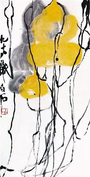 齊白石的《葫蘆》,被稱為是齊白石的絕筆,據(jù)說當(dāng)時齊白石為了畫這幅畫,一天早晨起來,沒有人攙扶,他自己從臥室踉踉蹌蹌地走進(jìn)畫室,站在桌前,擼起袖子,畫下了這一幅畫。據(jù)畫家李可染回憶,當(dāng)時的齊白石已經(jīng)是老糊涂了,“九”字不知道該怎么寫,到了“歲”就直接寫錯了,只能夠憑自己的直覺畫畫,即便是畫了一輩子的畫,但是到最后由于體力和腦力的不支,實(shí)在是畫不出來了。齊白石一開始用黃墨去畫葫蘆,畫下正確的一筆,一大一小,一前一后,一上一下。但當(dāng)他接著去畫葉子的時候出錯了,把葉子順即也畫成了葫蘆,且葫蘆留白處冒出兩筆淡墨,就好像葫蘆被打了兩個洞。當(dāng)畫藤蔓時,又恍惚了,畫著畫著又成葫蘆了。齊白石老人在做這幅畫時已經(jīng)是精力透支了,能畫出樣子來已經(jīng)實(shí)屬不易了,但是我們可以看到,其實(shí)齊老畫的這幅畫是別有一番風(fēng)韻在的,比如說他畫的藤蔓,這藤蔓真是絕了,能夠在不知不覺中畫出葫蘆的成熟、滄桑,把經(jīng)過風(fēng)吹雨打后形成的那種彎曲,表現(xiàn)得淋漓盡致。