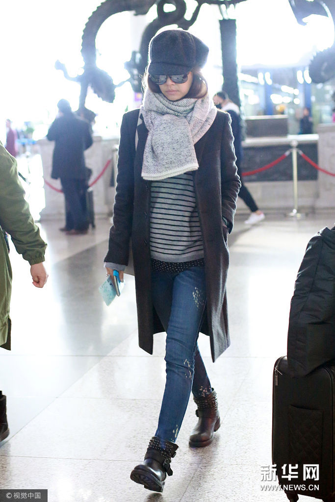 林心如報(bào)童帽黑色大衣鉚釘靴 知性優(yōu)雅