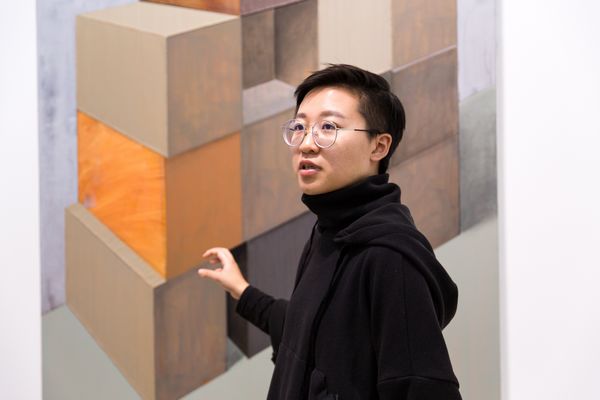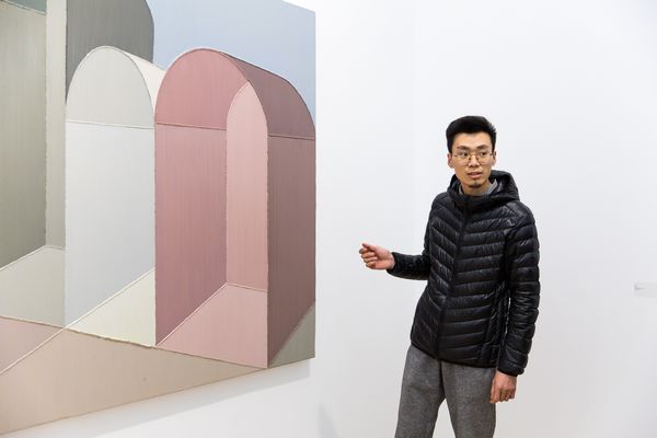 藝術(shù)家趙新宇,1989年出生于內(nèi)蒙古,2012年畢業(yè)于四川美術(shù)學院油畫系。趙新宇最早的創(chuàng)作,即為人所知的“車廂”系列,涉及了一種日常經(jīng)驗,后續(xù)階段的作品以情緒性和敘事性為底色,而使得整個畫面頗具戲劇色彩。在新作當中,這一痕跡的延伸則是趙新宇似乎試圖通過對畫面結(jié)構(gòu)的編排,對比之前的作品,依舊是在構(gòu)景,但卻在逐漸在取締物的現(xiàn)實性因素。新作當中技法的轉(zhuǎn)變,厚涂式的平推僅保留了一部分,新作當中的轉(zhuǎn)向在某種程度上僅僅構(gòu)成了對于厚涂畫法的一個對立面發(fā)生,像是一次新的開場,畫面本體基本問題再次噴涌而來,在這一情形下,趙新宇通過對于框架結(jié)構(gòu)式描繪的轉(zhuǎn)向,試圖引向一種對于畫面心理的感知。