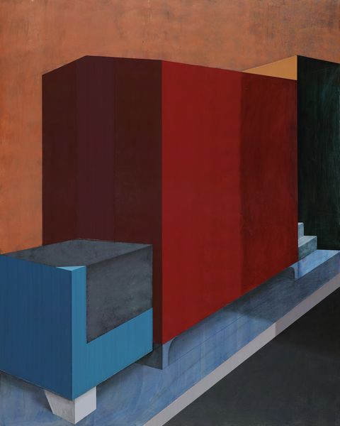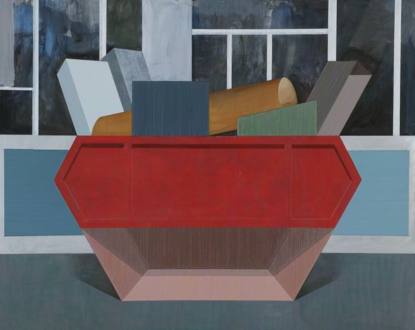 趙新宇作品當中的圖式來源,無論是從攝影作品中或者裝置作品中抑或現(xiàn)實當中選取某個場景的邊角,從某種程度上,均服從于他個人基于謹慎的、甚至敏感的內(nèi)在壓制,正如《室外2#容器》背景的窗框,稱其為窗框,倒不如把它當作畫面整體結(jié)構(gòu)的一個同級邏輯走向,正如同置放在背景前的所謂“容器”當中的幾何體,是幾何化了的現(xiàn)實物與根據(jù)畫面再行部分添加的合奏,在某種程度上,也可以說是塞尚繪畫理念的一則變異體。