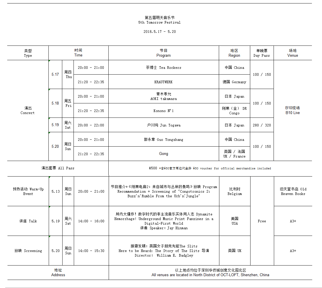 深圳新聞網(wǎng)訊 五月既至,好事即將發(fā)生。由深圳華僑城創(chuàng)意文化園主辦的第五屆明天音樂(lè)節(jié)將于2018年5月17日至20日在B10現(xiàn)場(chǎng)舉行。本屆明天音樂(lè)節(jié)作為“有形無(wú)界”華僑城創(chuàng)意文化園文博會(huì)分會(huì)場(chǎng)系列活動(dòng)的重點(diǎn)項(xiàng)目,將邀請(qǐng)來(lái)自6個(gè)國(guó)家的7組音樂(lè)家/藝術(shù)家,呈現(xiàn)包括演出、講座、紀(jì)錄片放映在內(nèi)的多元節(jié)目。除此之外,策展人將于5月13日在舊天堂書店做節(jié)前預(yù)熱,屆時(shí)會(huì)有節(jié)目介紹環(huán)節(jié)和一場(chǎng)完整的放映活動(dòng)。