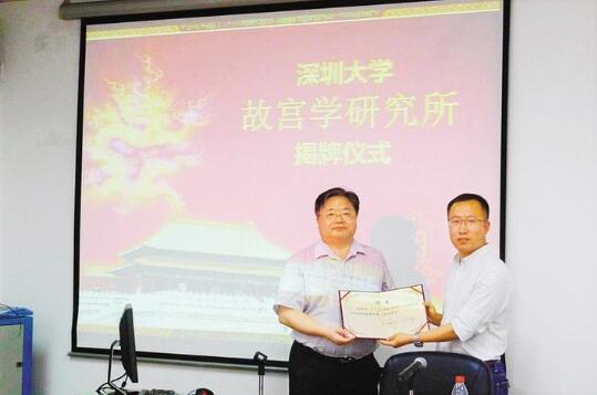 故宮博物院故宮學(xué)研究所所長(zhǎng)章宏偉(右)與深圳大學(xué)故宮學(xué)研究所所長(zhǎng)高志忠在深圳大學(xué)故宮學(xué)研究所掛牌儀式現(xiàn)場(chǎng)。