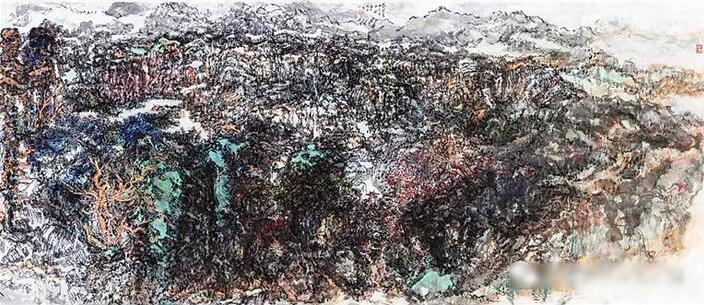 本次畫展題為“妙合化權(quán)”,出自宋代黃修復《益州名畫錄》:“大凡畫藝,應物象形,其天機迥高,思與神合,創(chuàng)意立體,妙合化權(quán)?!币饧瓷袼寂c物象相協(xié)調(diào),主觀創(chuàng)造與自然物象的妙合無礙,便能筆顯通神,創(chuàng)意無限,這也是中國畫家們追求的至高境界。孫克說,中國畫講究“外師造化,中得心源”?!皫煼ㄗ匀弧笔钱嫾异`感源泉,也促使中國畫藝術(shù)源遠流長,無窮無盡。李照東的新作墨彩繽紛,視覺張力恣肆磅礴,而畫面之中,溪谷幽深,流水潺湲,屋宇聚散,情趣盎然,足見畫家深得“造境”之妙。