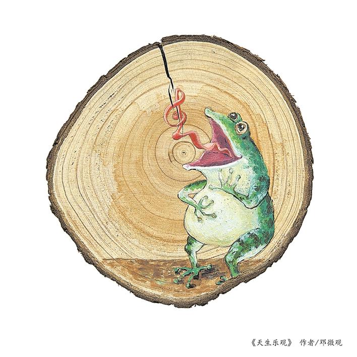 上榜漫畫家鄧微觀系深圳市寶安區(qū)打鐵文藝社社長,其《感物系列》以見物興感為主線,展開豐富的想象力,用動物擬人的方式幽默詼諧地抒發(fā)人生感悟,讓人會心一笑之余引起共鳴,令觀眾感嘆藝術(shù)家的漫無邊際的“腦洞”。對于作品首次入選國內(nèi)美術(shù)界規(guī)格最高的國展,鄧微觀很興奮:“這是對我這個系列作品的高度肯定?!薄陡形锵盗小废盗凶髌吩从谒e逛發(fā)呆時的想象碎片,將這個碎片貫穿就成了這個系列作品。鄧微觀在茶余飯后經(jīng)常到鐵崗的西鄉(xiāng)河邊散步,河中不時傳來低頻厚實(shí)的“男低音”引起他的注意,此起彼伏,聽來如交響曲一般通達(dá)舒暢。他循聲尋覓,原來是蛤蟆的聲音,只見這些“音樂家”在下水道洞口,在草叢中,河道縫中快樂地歡唱……這些天生的樂觀者給鄧微觀帶來美妙的心情,所以創(chuàng)作了這幅《天生樂觀》。再如《三餐之余》,有時飯后經(jīng)常會在茶幾前發(fā)發(fā)呆,思考人生不應(yīng)該只是面包和蘋果,還應(yīng)有點(diǎn)別的……