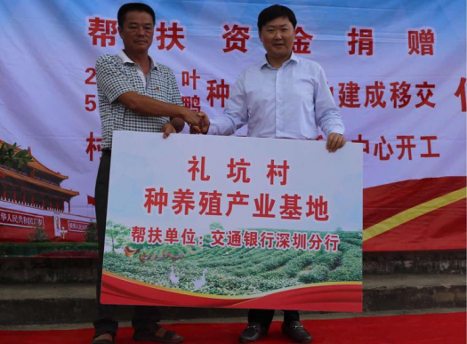 當日,交通銀行深圳分行籌劃建設的茶山、種養(yǎng)殖基地、新一批雞苗和2017年度專項扶貧資金正式移交和撥付給禮坑村,并舉行了村民文化廣場開工奠基典禮。陳隃表示,交行深圳分行把幫扶禮坑村做為落實黨的政策的重點工作,做為國有銀行承擔政治責任、社會責任的重要出發(fā)點,做為加強黨的建設的重要抓手,下一步圍繞三個轉(zhuǎn)變繼續(xù)深化扶貧工作,一是工作目標轉(zhuǎn)向社會主義新農(nóng)村建設,努力將禮坑村建設成新農(nóng)村建設示范村中的示范點;二是工作方法從貧困戶脫貧向產(chǎn)業(yè)脫貧轉(zhuǎn)變,繼續(xù)發(fā)掘新項目,形成更加持續(xù)化的產(chǎn)值和收益;三是在制度建設上下功夫,強化社會主義新農(nóng)村建設的制度先行和制度示范。