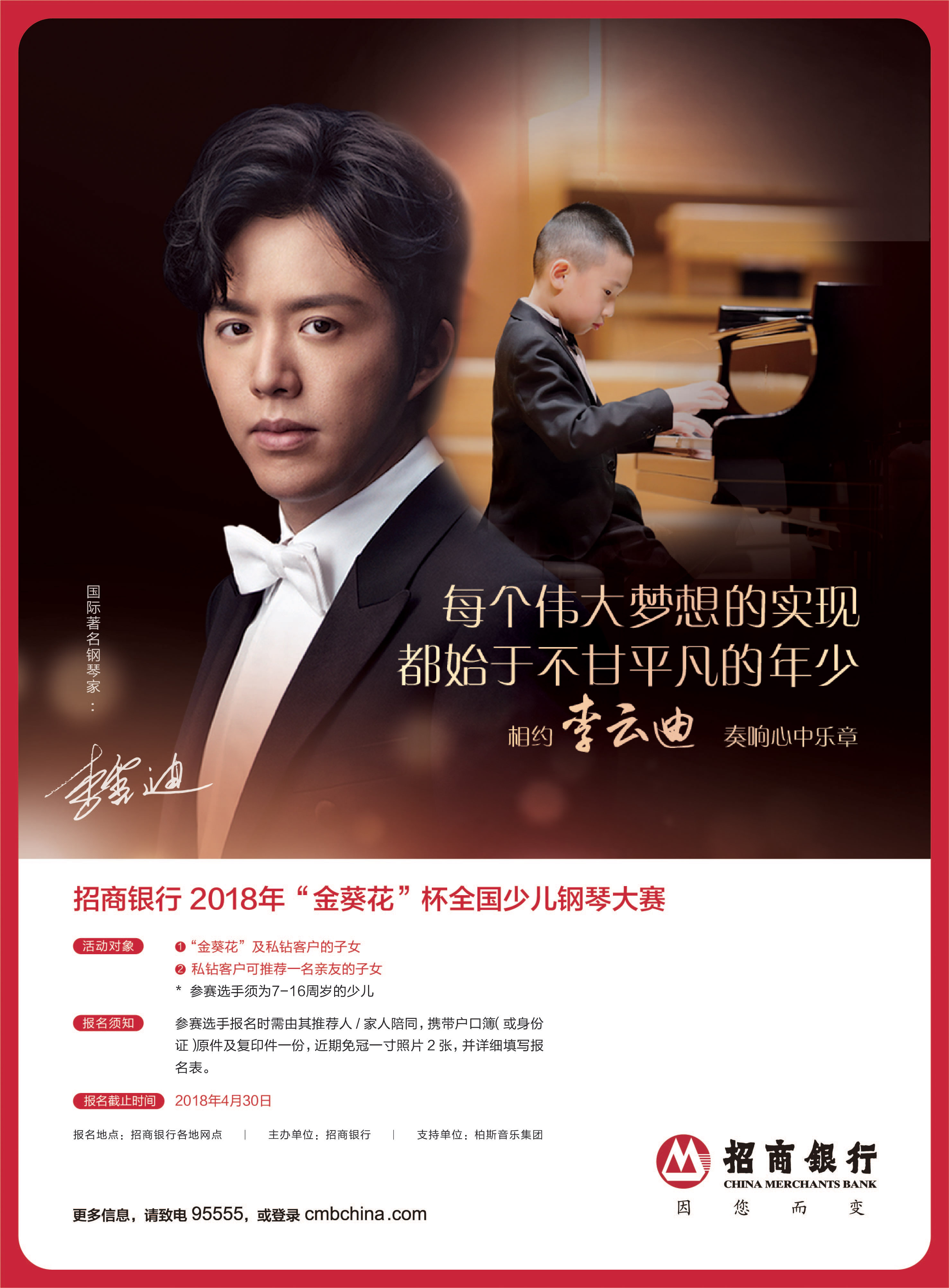 據(jù)大賽組委會(huì)介紹,本屆大賽主辦單位為招商銀行,支持單位為柏斯音樂(lè)集團(tuán)。報(bào)名時(shí)間截止至4月30日,初賽將在5月進(jìn)行,7月下旬舉行總決賽。招商銀行“金葵花”客戶、私鉆客戶7至16周歲的子女均可報(bào)名參賽。此外,私鉆客戶還擁有額外推薦一名選手參賽的權(quán)益。