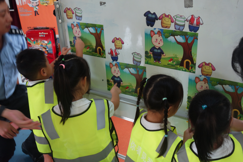 熊警官從交通工具講起,分別講述了乘坐不同交通工具所帶來的風(fēng)險及注意事項(xiàng),并通過幽默風(fēng)趣的“兒童安全座椅”小視頻,提醒在座的小朋友及家長要注意細(xì)節(jié),具有防范風(fēng)險的意識。在互動游戲環(huán)節(jié),熊警官通過與小朋友們的互動,講解了紅綠燈的來源、日常的交通標(biāo)識以及過馬路的規(guī)則?,F(xiàn)場的同學(xué)們也非常踴躍,在“被看見才安全”環(huán)節(jié)時,許多小朋友主動上臺,給小兔子穿上最亮最顯眼的衣服,使其成為最靚的仔。