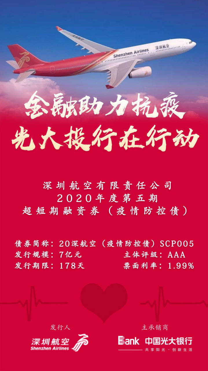 深圳新聞網(wǎng)2月12日訊 為積極響應(yīng)國家抗疫號召,支持疫情防控企業(yè)債券融資,光大銀行總行戰(zhàn)投部和深圳分行迅速反應(yīng),堅決貫徹落實光大集團及光大銀行總行黨委關(guān)于新型冠狀病毒肺炎疫情防控的有關(guān)要求,于2月11日成功發(fā)行深圳航空有限責(zé)任公司2020年度第五期超短期融資債券(疫情防控債) ,發(fā)行規(guī)模7億元,期限178天,票面利率僅為1.99%。其中,2億元募集資金將用于補充深圳航空為旅客免費辦理退票、改期等支出產(chǎn)生的營運資金需求以及免費提供防疫物資、醫(yī)療人員等運輸產(chǎn)生的營運資金需求。