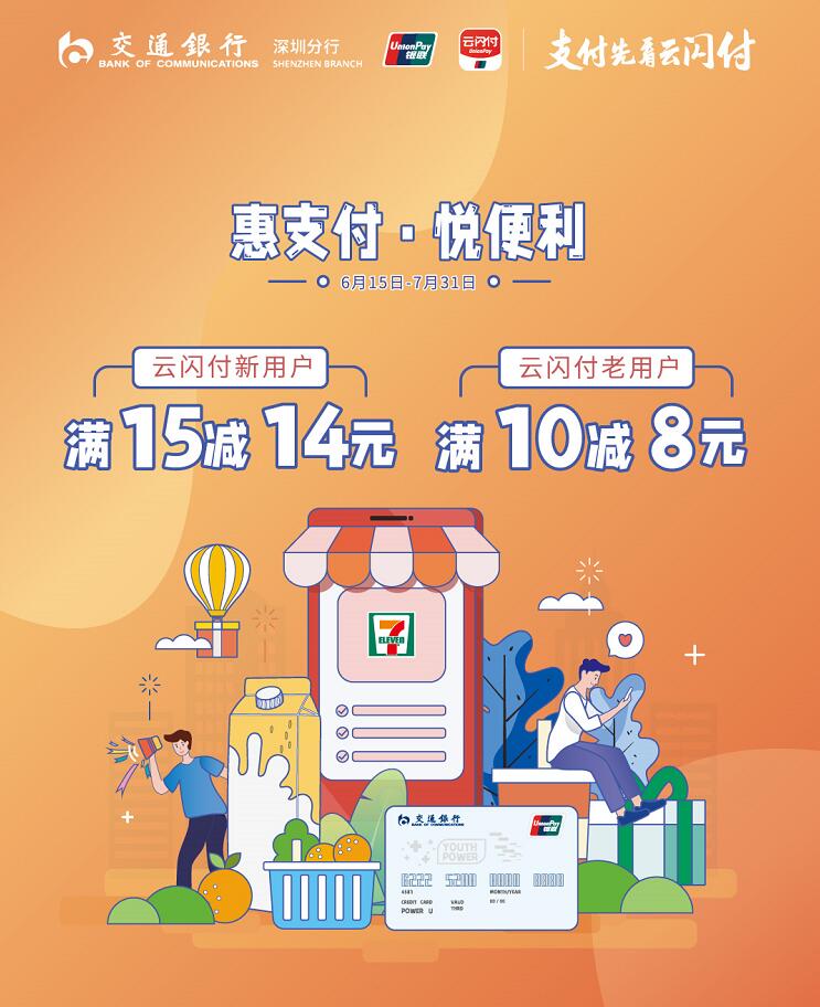 近日,交通銀行深圳分行、云閃付、7-Eleven攜手開(kāi)展“惠支付,悅便利”活動(dòng),在7-Eleven用銀聯(lián)二維碼支付享立減優(yōu)惠。