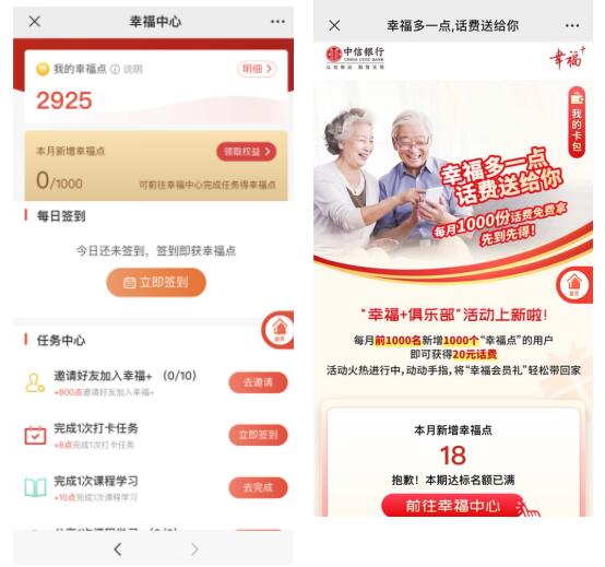 中信銀行“幸福+俱樂部”“幸福+財(cái)富”頁面展示