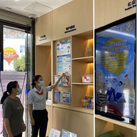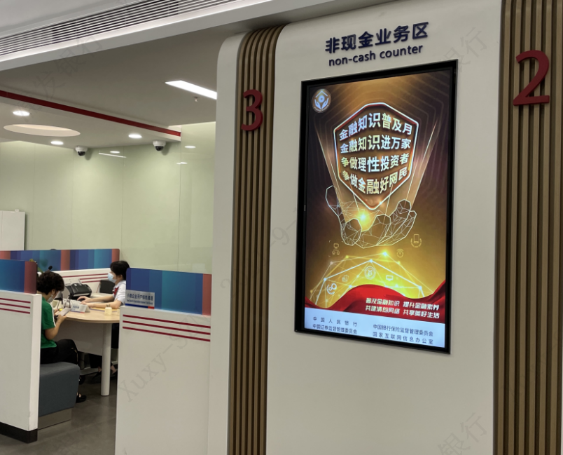 在網(wǎng)點(diǎn)營(yíng)業(yè)大廳內(nèi),電子屏中的2021年金融知識(shí)普及月海報(bào)營(yíng)造了良好宣傳氛圍。金融之手,強(qiáng)而有力,各營(yíng)業(yè)網(wǎng)點(diǎn)一手承接了金融知識(shí)普及多方面的內(nèi)容,共同構(gòu)建了線上線下、電信、網(wǎng)絡(luò)等多渠道傳播的金融知識(shí)普及傳播網(wǎng),有力推進(jìn),勢(shì)在必行。