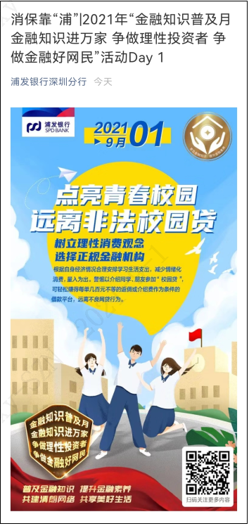 9月1日,也是校園開(kāi)學(xué)的日子。開(kāi)學(xué)的第一天,浦發(fā)銀行深圳分行特別推出“點(diǎn)亮青春校園遠(yuǎn)離非法校園貸”日歷宣傳海報(bào),并在官方微信公眾號(hào)進(jìn)行轉(zhuǎn)發(fā)宣傳,同時(shí)在46家網(wǎng)點(diǎn)營(yíng)業(yè)大廳顯示屏播放,重點(diǎn)傳播校園貸金融知識(shí),提醒學(xué)生人群,合理消費(fèi),遠(yuǎn)離不良網(wǎng)貸行為。據(jù)悉,該行將在九月每個(gè)工作日持續(xù)發(fā)布消保宣傳日歷,常態(tài)化長(zhǎng)效推進(jìn)金融知識(shí)普及月宣傳活動(dòng)的開(kāi)展。