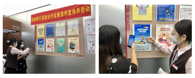 在深圳招行的各營(yíng)業(yè)網(wǎng)點(diǎn),成立了“支行守衛(wèi)隊(duì)”。依托網(wǎng)點(diǎn)優(yōu)質(zhì)設(shè)施資源,各網(wǎng)點(diǎn)通過懸掛主題宣傳橫幅、LED屏幕滾動(dòng)播放、在廳堂、等候區(qū)、柜臺(tái)等醒目位置擺放反假知識(shí)宣傳折頁和海報(bào)等方式,營(yíng)造傳統(tǒng)模式宣傳好氛圍。此外,在網(wǎng)點(diǎn)設(shè)立的營(yíng)業(yè)廳小課堂,現(xiàn)場(chǎng)講解現(xiàn)行流通人民幣的票面知識(shí)、防偽特征及識(shí)別方法;制作“2021海報(bào)答題”海報(bào)引導(dǎo)市民掃碼,開展答題有禮的方式提高大家的參與積極性,寓教于樂開展了反假幣知識(shí)的宣傳。