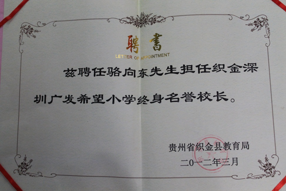 2013年,在駱向東的退休儀式上,織金縣教育局將一張希望小學終身名譽校長的聘書,鄭重交到了他的手上?!拔液軜s幸能代表廣發(fā)銀行深圳分行黨委去推動這件事,但公益事業(yè)任重道遠,我相信愛心基因會在廣發(fā)一直傳承下去。”事實也正如駱向東所言,從1998年籌建希望小學至今,一代代廣發(fā)人身體力行,讓愛心助學一棒接力一棒。