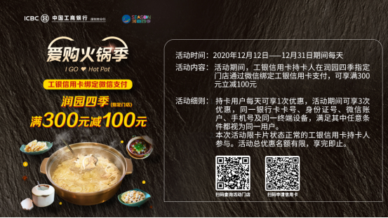12月31日前每天,微信綁定工銀信用卡在潤(rùn)園四季指定門店消費(fèi)滿300元減100元!