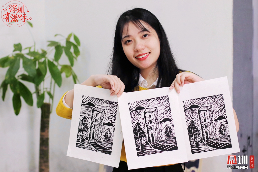 在版畫家龍潤(rùn)慧老師的指導(dǎo)下,記者張藝齡以碉樓為主題的版畫作品完成了。