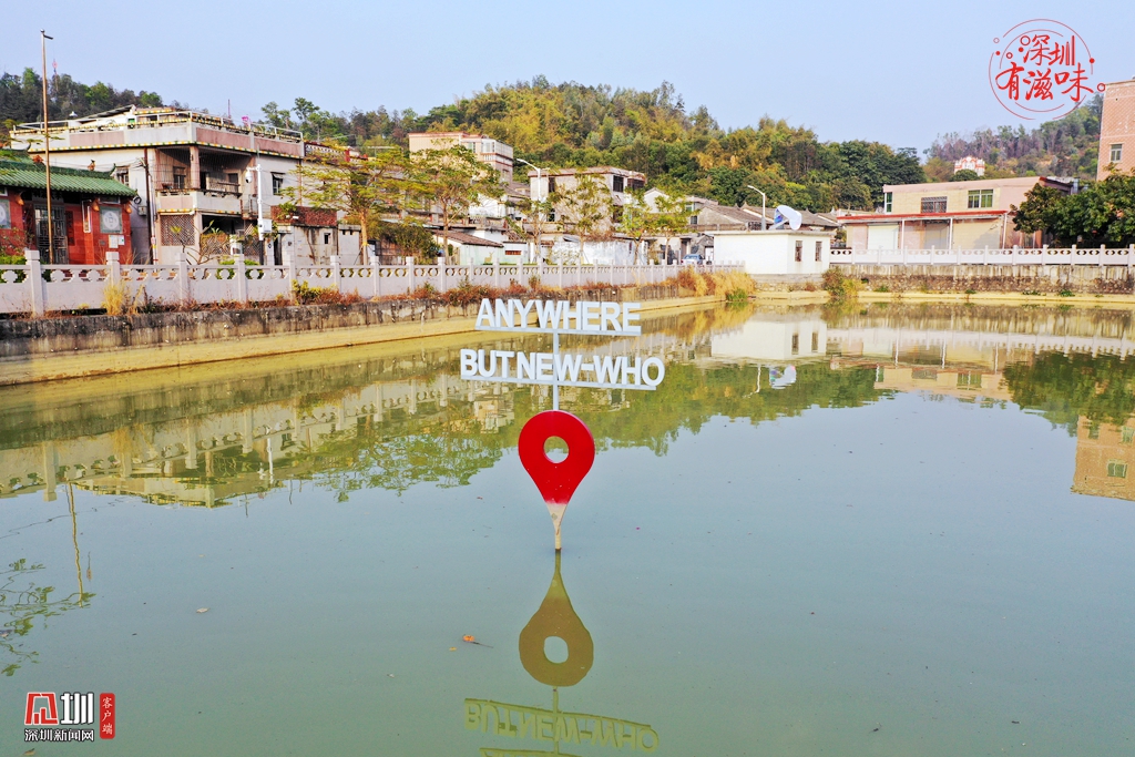 村口半月形水塘里,紅色坐標“ANYWHERE BUTNEW-WHO”。